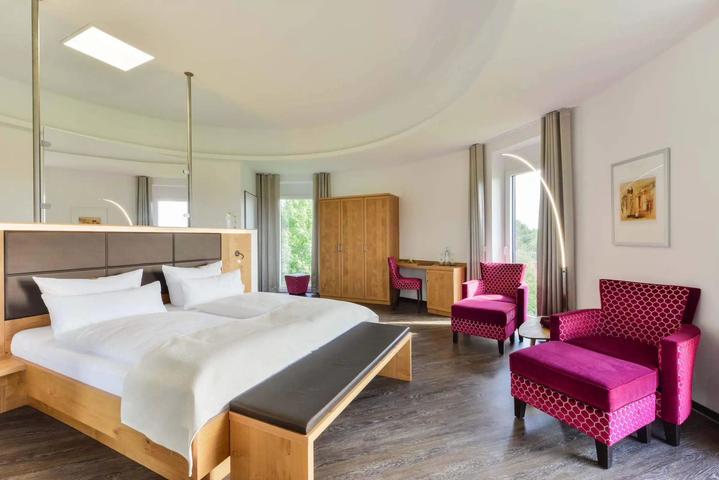 Unsere stilvoll eingerichteten Zimmer und Suiten bieten Ihnen allen Komfort für einen erholsamen Aufenthalt. Genießen Sie den Blick auf den Golfplatz und die umliegende Natur aus Ihrem Zimmer.